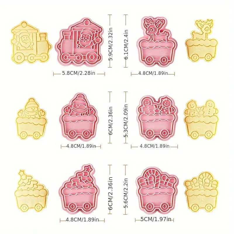 Set de 12 Cortadores y Sellos 3D con 6 Diseños de Vagones Navideños que transforman tus galletas y fondant en un tren festivo completo.